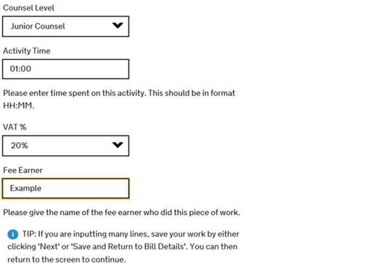 When all work has been completed for the solicitor you can click Next which will then move on to billing on behalf of counsel.