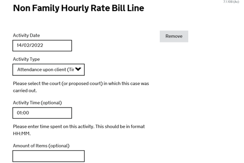 NOTE: CCMS will generate the correct rate from the rules base, therefore you only need to confirm either the hourly rate, enhancement and VAT or the number of items (such as letters, enhancement, and VAT.