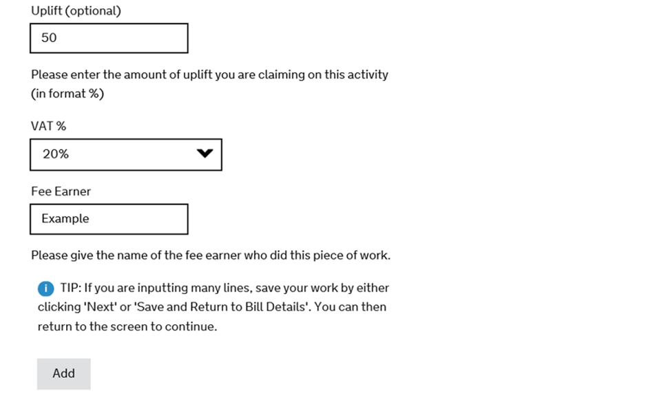 You should enter each line of work undertaken from your file such as 1 hour of attendance on the client, clicking ‘Add’ after each one.