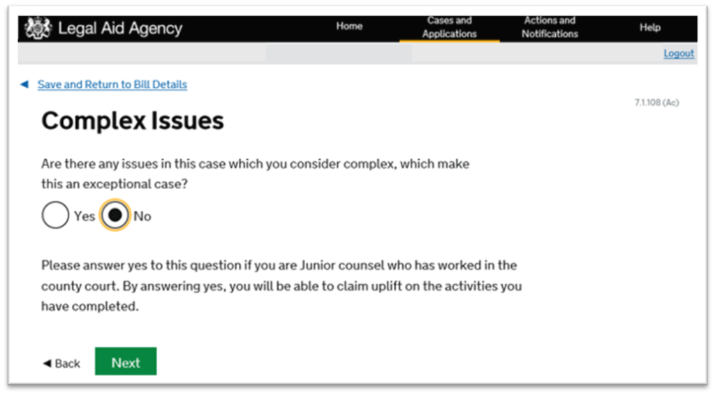 Billing on behalf of Counsel will initially ask if you Counsel will be claiming enhancement (only if they are Junior Counsel in the County Court) on their costs. You should reply accordingly and move on to the next screen.