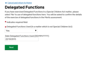 NOTE: For Special Children Act cases answer No to the delegated functions question. You will be asked for further details in the merits assessment.
