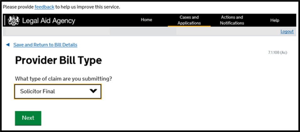 Ensure you have the option for ‘Solicitor Final’. If you do not, please check the Outcome task has been submitted for every proceeding on the certificate.