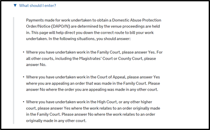 The payment scheme for DAPOs is determined by the court venue and not the contract held by a provider. CCMS will therefore ask you to confirm whether proceedings were issued in the Family Court or not? You should answer ‘No’ for proceedings issued in the County Court or Magistrates Court.