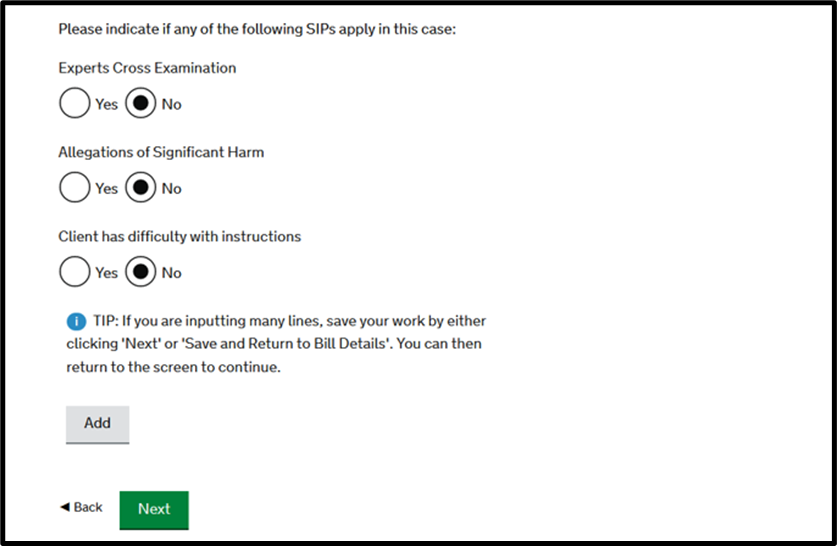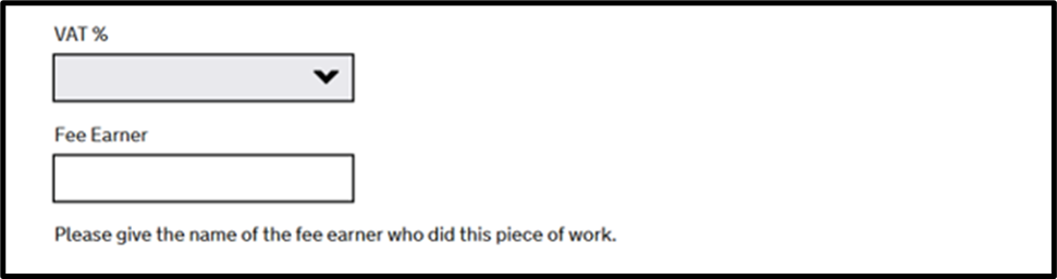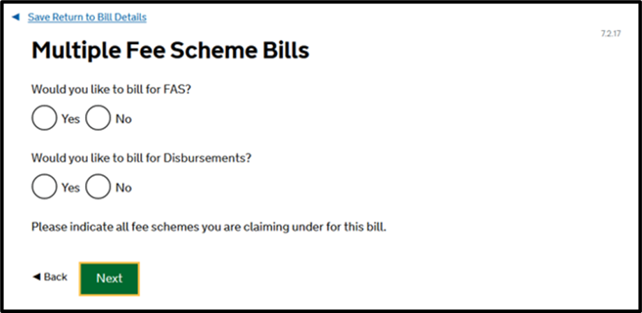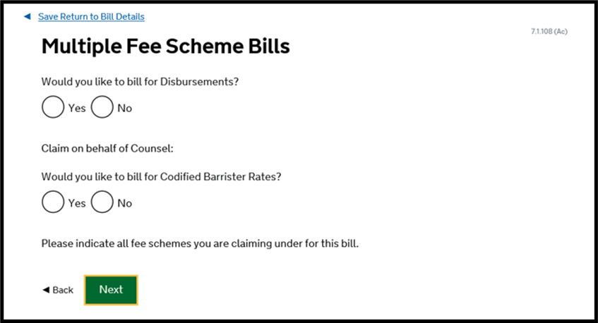 You will then reach the below question. You should indicate ‘Yes’ where you are billing on behalf of any counsel in the 2nd question and ‘Yes’ to the first question if you have any disbursements to claim.