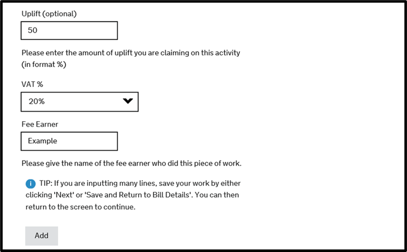 You should enter each line of work undertaken from your file such as 1 hour of attendance on the client, clicking ‘Add’ after each one. CCMS will generate the correct rate from the rules base, therefore you only need to confirm either the activity type and activity time for non-routine work or the activity type and amount of items for routine work, such as routine letters and telephone calls.