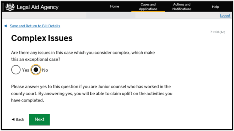 Billing on behalf of counsel will initially ask you if counsel will be claiming enhancement (only if they are junior counsel in the County Court) on their costs. You should reply accordingly and move on to the next screen.