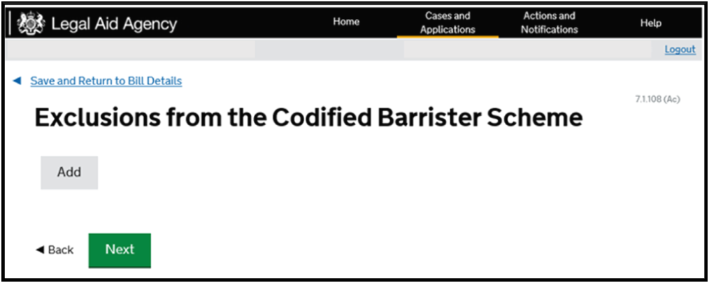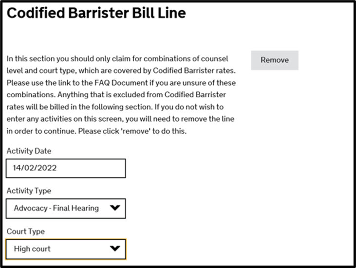 Codified Barrister Rates Screen. If you are not claiming within the Codified Rates Scheme for counsel, click ‘Remove’ on the bottom of this page and go to the ‘Exclusions from Codified Rates’ Screen. This will be where there is no combination of counsel and court which falls under the Codified Rates.