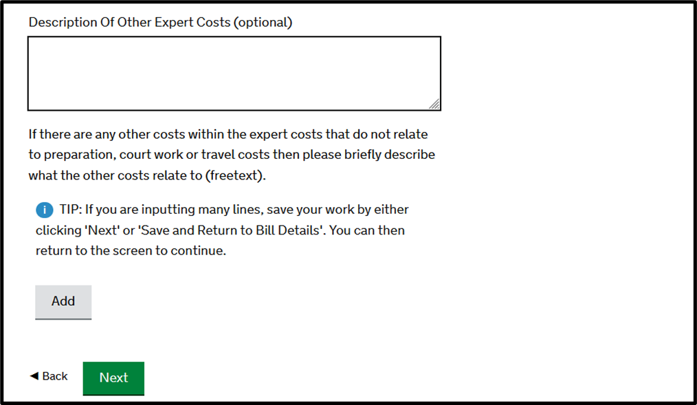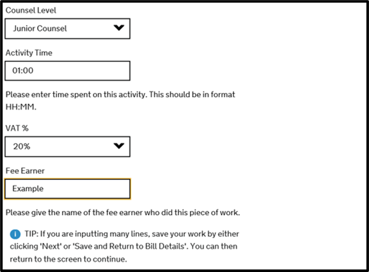When all work has been completed for the Solicitor, you can click ‘Next’ which will then move on to billing on behalf of counsel.