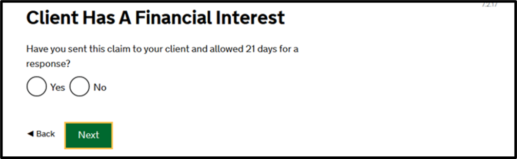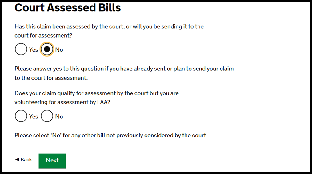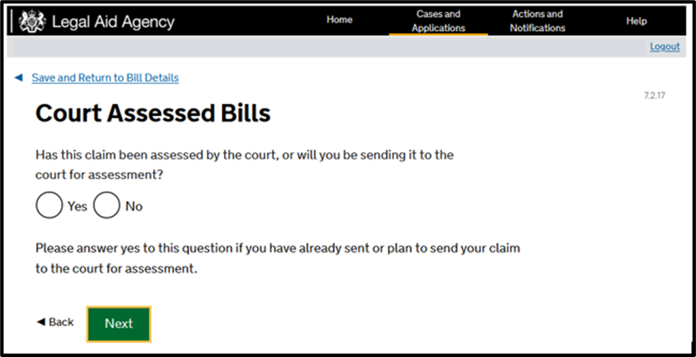 Follow the questions through, answering if the client has a financial interest (such as paying contributions, revoked certificate, and financial recovery) and if the bill has been court assessed (generally, proceedings in the Magistrates’ Court will not qualify for court assessment). Further guidance on court assessment, including where costs payable to the Client by another party to the proceedings have been ordered is available in Section 15 Costs Assessment Guidance