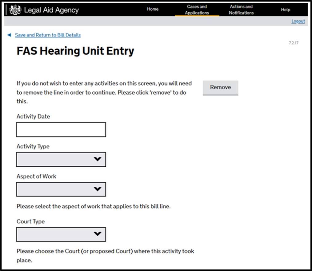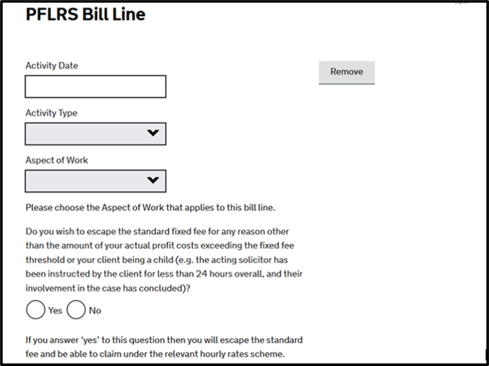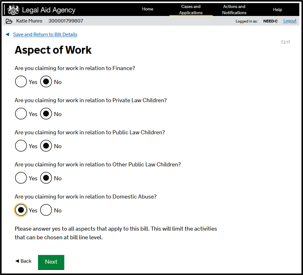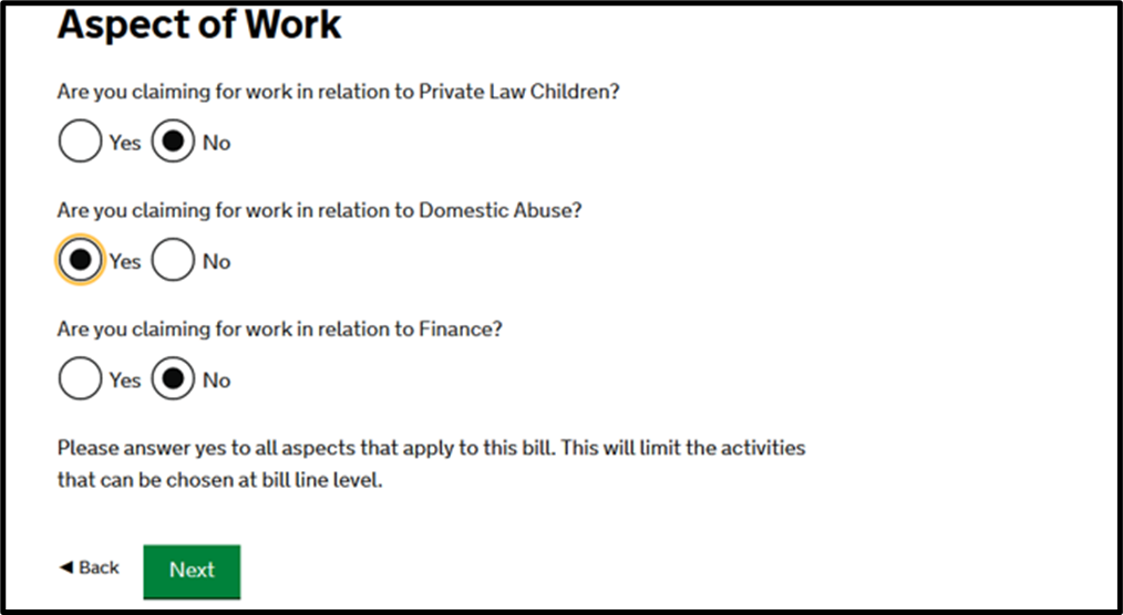 Where your claim falls under the PFLRS and FAS you should claim for work in relation to the Domestic Abuse Aspect. Please note, if you are representing a child (eg a client under 18 when the certificate was first issued), you will be taken to the Prescribed Family Hourly Rates screen instead.