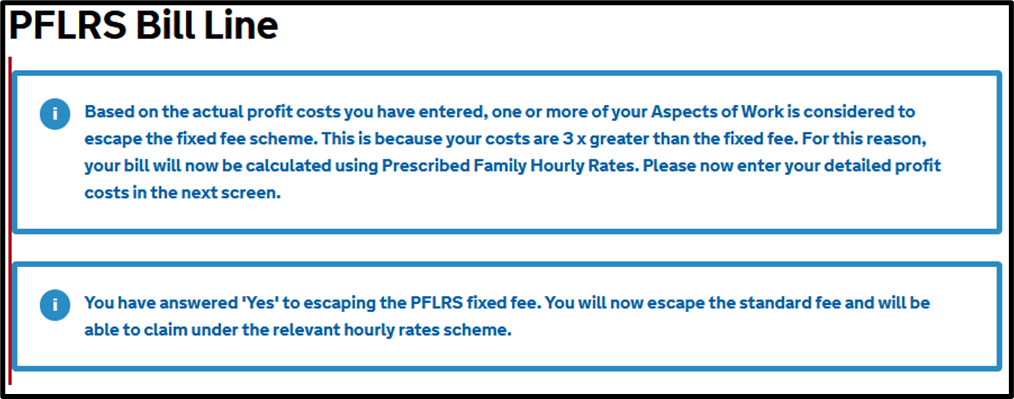 If profit costs are three times the fixed fee your claim will escape the fixed fee. You will receive the following messages and will be directed to the Prescribed Family Hourly Rates screen.