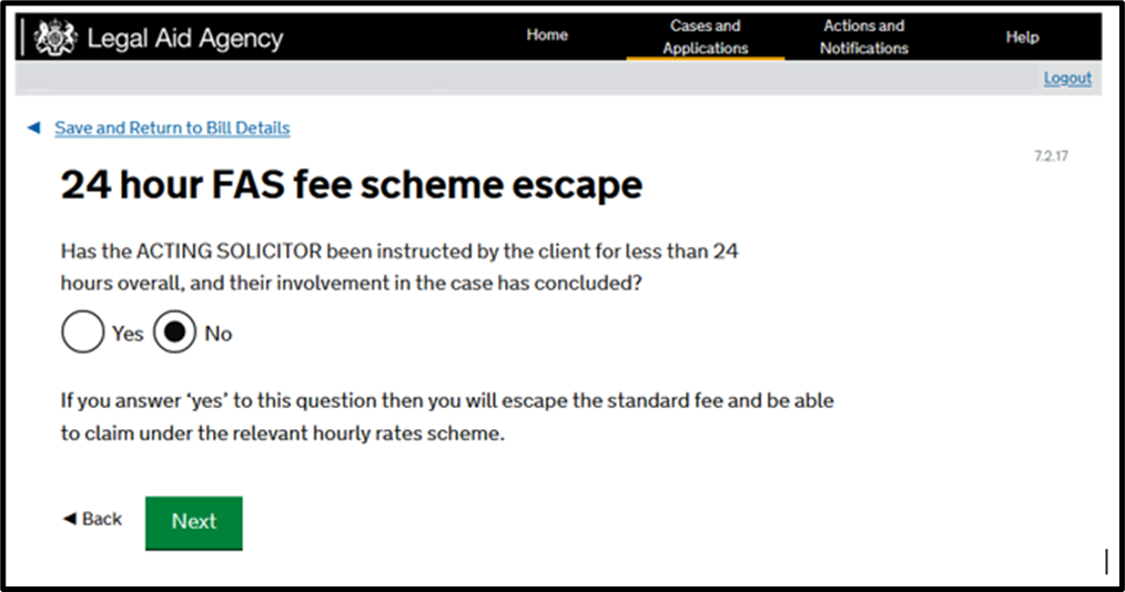 Answer ‘No’ where you have been instructed for 24 hours or more. You will then move onto the FAS screens. By answering ‘Yes’ you will progress through the hourly rate payment screens.
