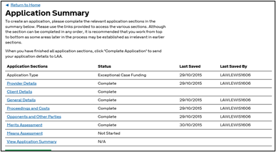 NOTE: All application sections must have a status of complete before the means and merits assessments can be accessed.