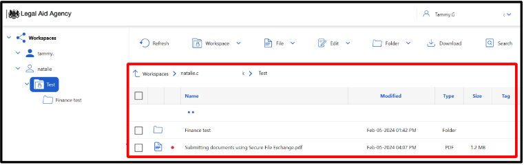 Once you have logged into Galaxkey, you will see your home page which shows your account and the workspaces you have been assigned. You must upload your files to the correct workspace, so they are visible to the relevant LAA teams / individuals.