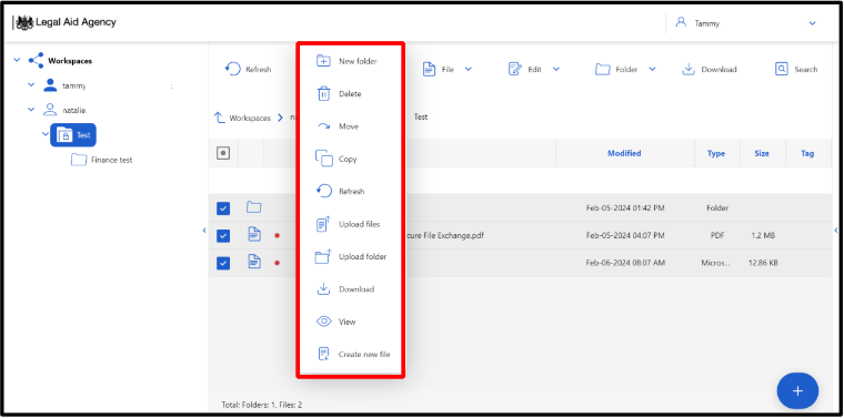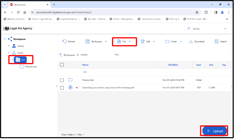 To upload a new folder / file: Click on the relevant folder (the test folder has been selected in this example). Select File. Alternatively, select +Upload in the bottom right of your screen.