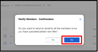 Once the upload is complete, it will appear in the workspace. You will be asked if you want to notify members of the file/folder you have uploaded. Select Yes.