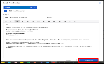 You will see the workspace LAA email address and the message to be sent. You can make amendments to the email, for example, to inform the recipient there is sensitive/graphic material. Select ‘Send email’.