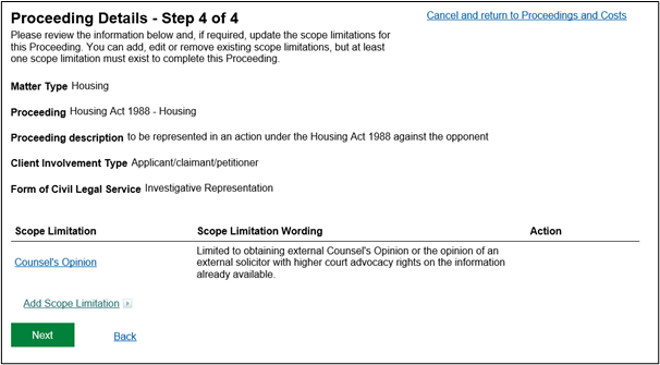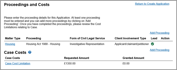 A housing application with a housing proceeding and one scope limitation has been created. If additional proceedings are required click Add Proceeding otherwise click Return to Create Application to continue creating your application.