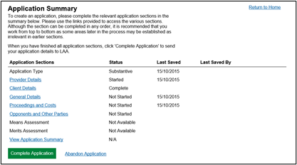 When returned to the Application Summary screen the Means and Merits Assessment sections will be available to complete. Click the respective section headings to begin.