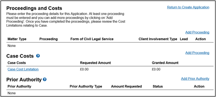 After registering a client in CCMS you will be directed to the Application Summary page. The provider details, general details and opponents and other parties sections can be completed as normal.