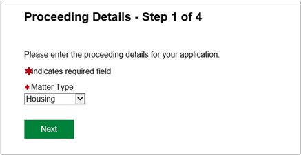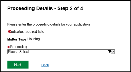 Choose a proceeding from the Proceeding drop-down. Numerous housing proceeding options will be available.
