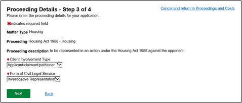Specify the Client Involvement Type and Form of Civil Legal Service and click Next.