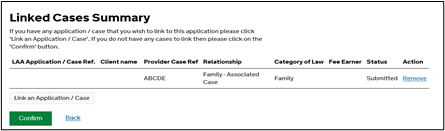 The LAA encourage that cases be linked as part of the initial application process. In order for one case to be linked to another, one case must already be submitted. Make a note of the case reference number of the previously submitted case.