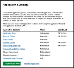 - The Application Summary screen will appear again in order for all sections to be completed accordingly. Once completed, the application can be submitted.