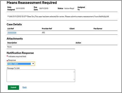 Once submitted, you must return to the Means Reassessment action and provide a response.