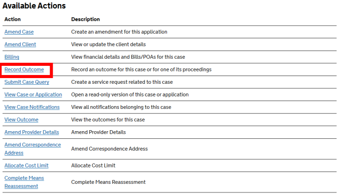 NOTE: You should record the outcome of the case first and will then either be able to submit a bill or a nil bill depending on the circumstances of the outcome of the case.