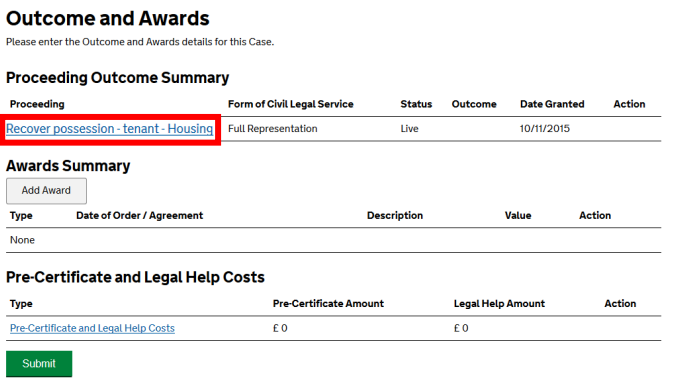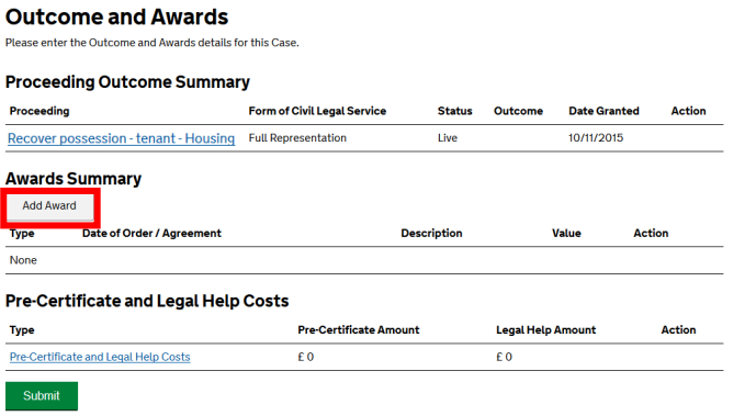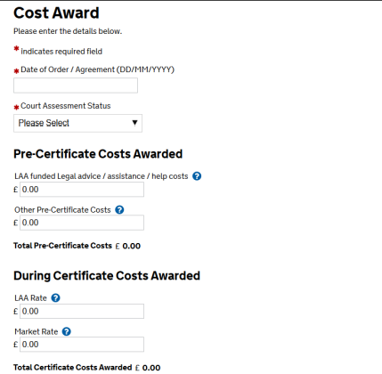 This is the Outcome and Awards screen where you are able to record the outcome of the case, enter any awards or specify any pre-certificate or legal help costs.