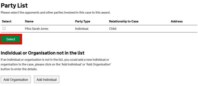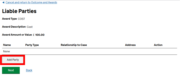 The other parties registered on the case will be listed for you to specify if they are involved in the cost award by ticking the box.
