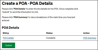 A Submission Confirmation screen confirms the POA has been sent to the LAA.