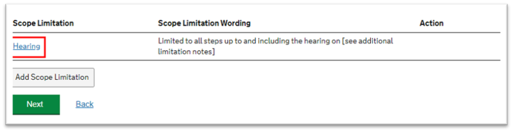 Select ‘Confirm’ to return to the Proceeding Details screen. It will not be necessary to add a further Scope Limitation. Select ‘Next’ to confirm the Scope Limitation details.