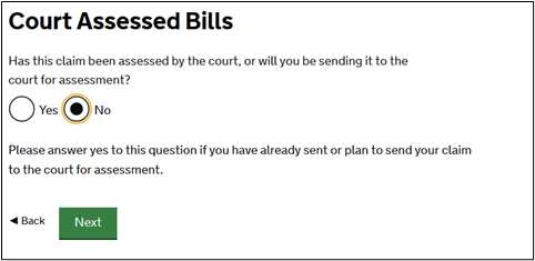 When you come to the court assessment question answer No for LAA Assessed Bills.