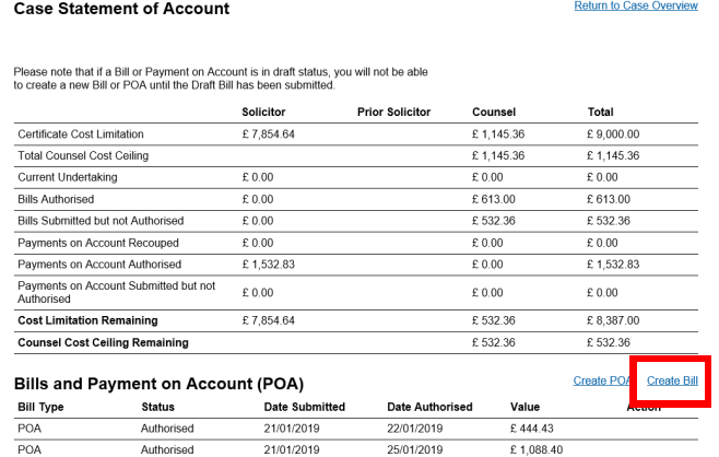 Click Create Bill from the Case Statement of Account screen.