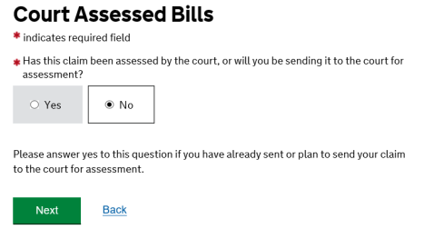If the answer to this question is yes, please follow the Advanced Guide ‘Court Assessed Bills’.