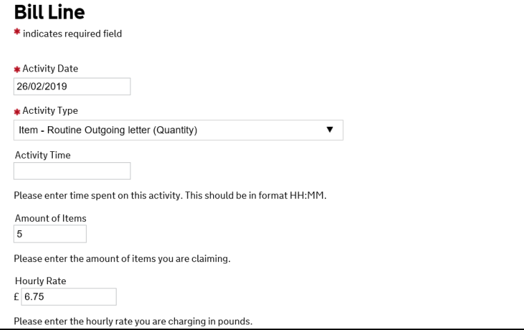 The Bill Details screen is where the costs incurred in the case are entered. Each item of work should have its own line, though letters and calls can be claimed at summary level. Remember the following when entering: